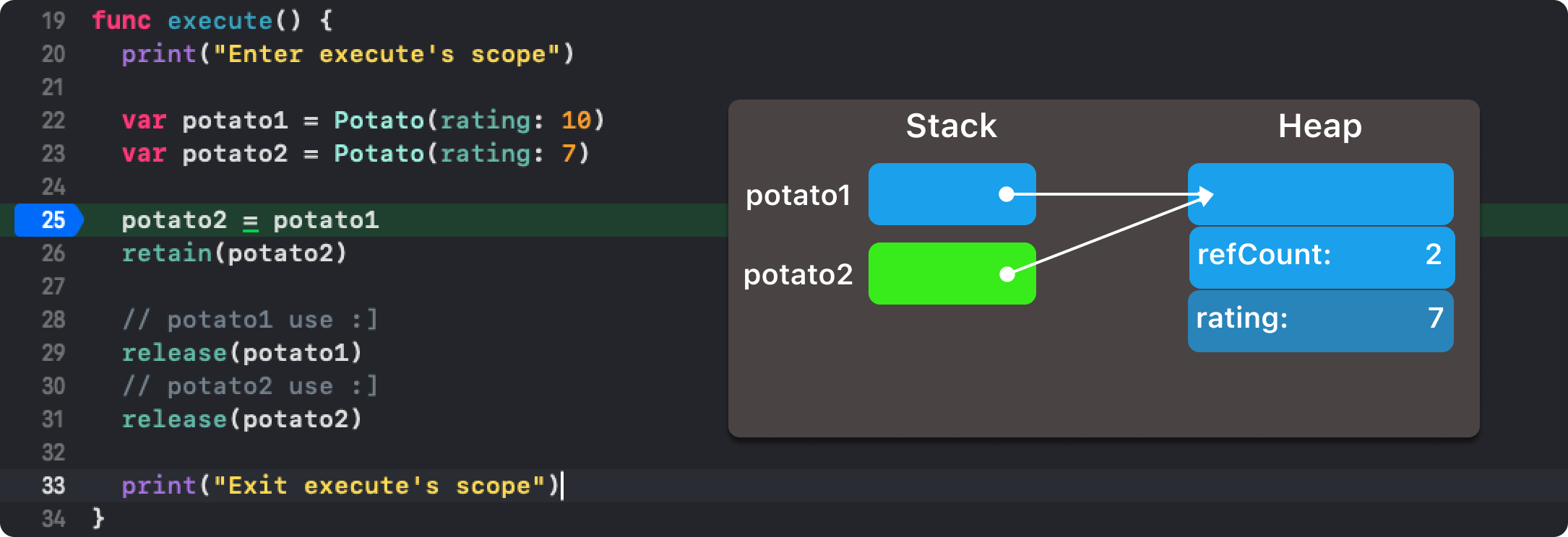 다시 돌아와서 23라인을 실행한다면 potato2 또한 자신만의 refCount 1로 갖게 될 것입니다. 그리고 위 사진과 같이 25라인을 호출했을때의 결과로 potato1도 potato2의 메모리를 참조하고, refCount는 2가 됩니다.