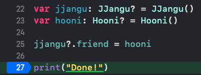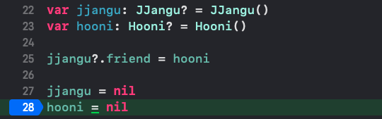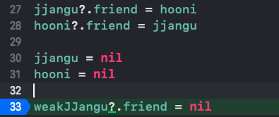 이유는 간단합니다. Reference count가 1로 여전히 유효하기 때문입니다. 비록 jjangu인스턴스는 nil이 됬지만 deinit은 호출되지 않습니다. deinit이 호출되는 시점은 reference count가 0인 시점입니다. 여전히 hooni.friend가 짱구를 참조하고 있기 때문입니다 XD