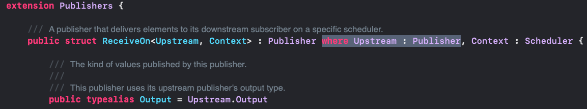 Upstream Publihser's Output type과 Output이 일치해야지만 Publisher와 Subscriber가 Subscription을 통해 reqeust(_:)가 가능한것은 당연합니다. 이 관점이 아니라, ReceiveOn을 생성할 때는 Upstream의 제너릭 타입을 지정해야만 합니다. 위 코드에서 그 upstream이 반환하는 Publisher의 타입은 Publishers.SubscribeOn<Self,S> 를 반환합니다🤩 그래서 최종적으로 저렇게 감싸져서 반환됩니다.