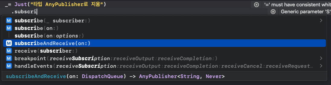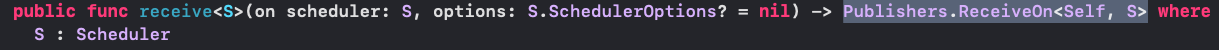 마찬가지로 이 함수를 호출했을 때의 반환타입은 Publishers.ReceiveOn<Self, S>가 됩니다.