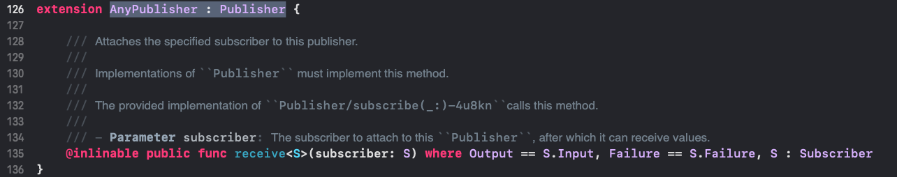 위에서 언급했지만, 이 타입은 Publisher protocol을 준수한 구조체입니다. Publisher를 준수했기에 AnyPublisher 타입을 사용하기 위해서 명확하게 Output, Error 타입을 선언해야 합니다. 역시 구조체에서 receive(subscriber:)를 구현했을 것으로 예상됩니다. 즉, subscriber가 subscribe(_:)를 통해 구독을 요청할때 subscriber한테 Output을 방출할 수 있습니다.