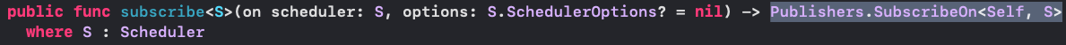 이 함수를 호출했을 때의 반환타입은 그래서 Publishers.SubscribeOn<Self, S>가 됩니다. ( cf. 이때 Self가 만약 Publishers. Zip, MergeMany Etc... operator를 사용했다면 실제로 컴파일러가 더 복잡하게 표시, 추론을 할 수 있습니다. 근데 AnyPublisher 타입을 사용한다면? 좀 더 단순해지니.. 추론을 쉽게하지않을까 하는 개인적인 생각입니다.)