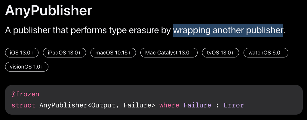 사실 Publishers.ReceiveOn도 Publisher protocol을 준수한 구조체이고, AnyPublisher 또한 Publisher protocol을 준수한 구조체인데, AnyPublisher를 사용하면 좋은 장점은 위에 보셨듯이 타입을 AnyPublisher로 단순화 할 수 있습니다. 정말 공식문서에 나왔든 기존 upstream publishers를 another publisehr(AnyPublisher)로 wrap합니다. 그러기에 AnyPublisher타입이 보여지게 되는 것입니다.