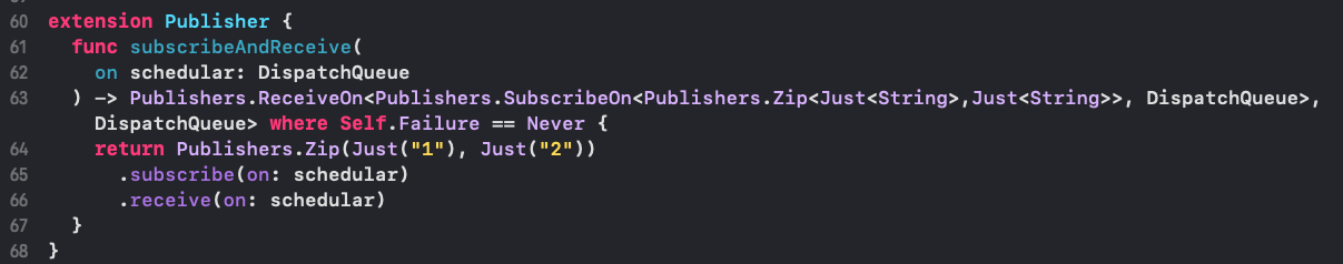 함수의 반환타입이 명확, 단순하게 할수록 이 함수를 호출하는 입장에서도 명확하게 파악할 수 있습니다. 또한 함수의 반환타입을 Publishers의 특정 구체타입으로 하지 않을 경우에도 장점이 존재합니다. 아래 코드를 직접 보며 이해해보면 좋을것 같습니닷: ]