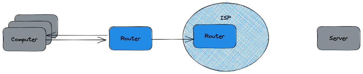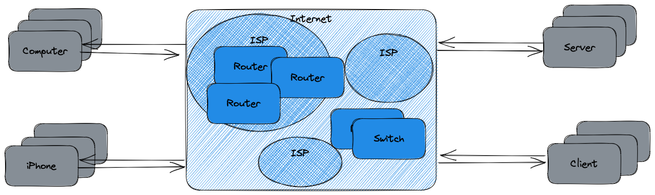 ISP(Internet Service Provider. e.g. kt, skt, lg etc...)에는 여러 router들이 있습니다. 이 라우터들은 덩어리 형태로 연결되어 데이터 패킷을 최적의 경로로 전달해 네트워크를 구성합니다. 이런 네트워크들이 모인 네트워크를 인터넷이라고 합니다.