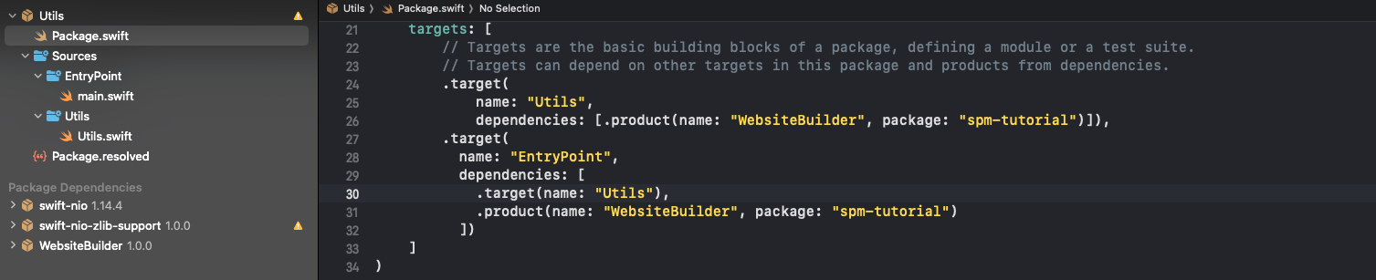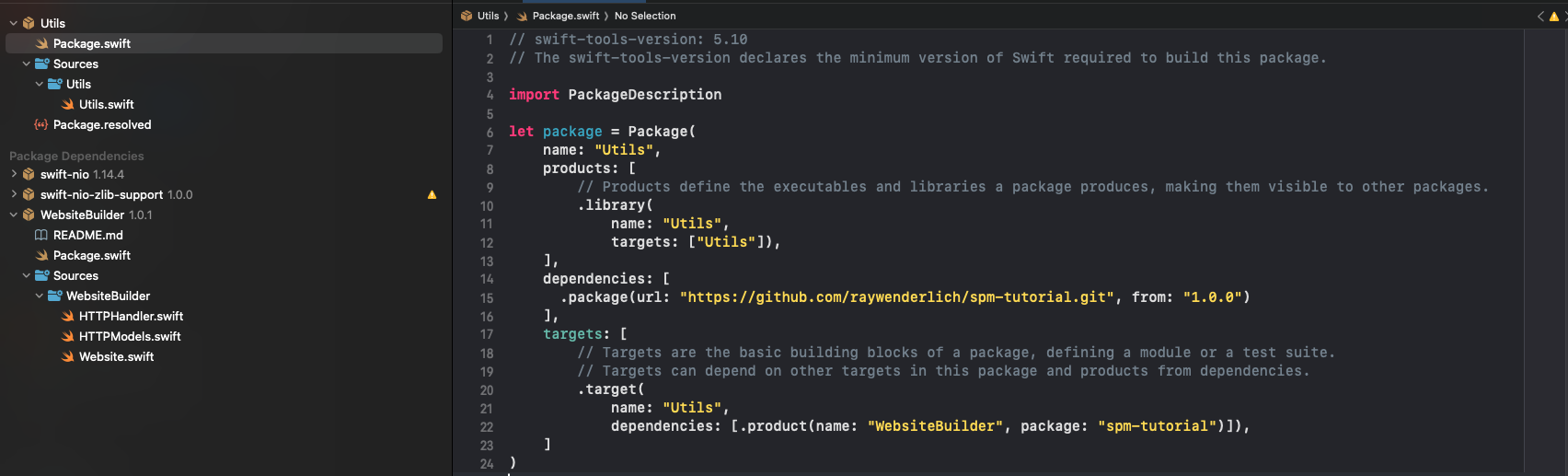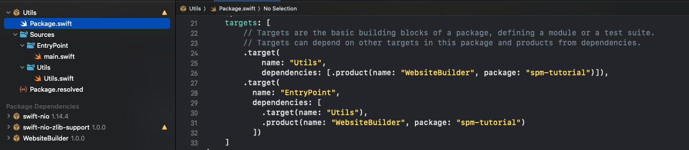 즉 Utils Project는 WebsiteBuilder를 의존하게 됩니다. Package에서 dependencies에 product를 url을 통해서 Package내부에 추가가 됬기에, Utils target이 WebsiteBuilder Module을 import할 수 있게 dependency를 추가하면 됩니다.