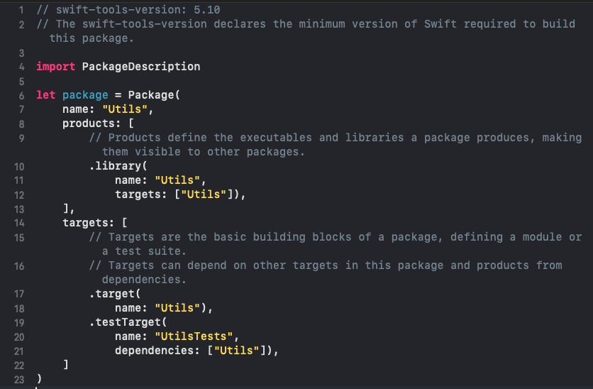 여기서 기본 구성은 Utils 이름을 갖는 Package와 내부에 Utils 라이브러리 및 Utils 타겟, 테스트 타겟이 기본적으로 추가 됩니다.