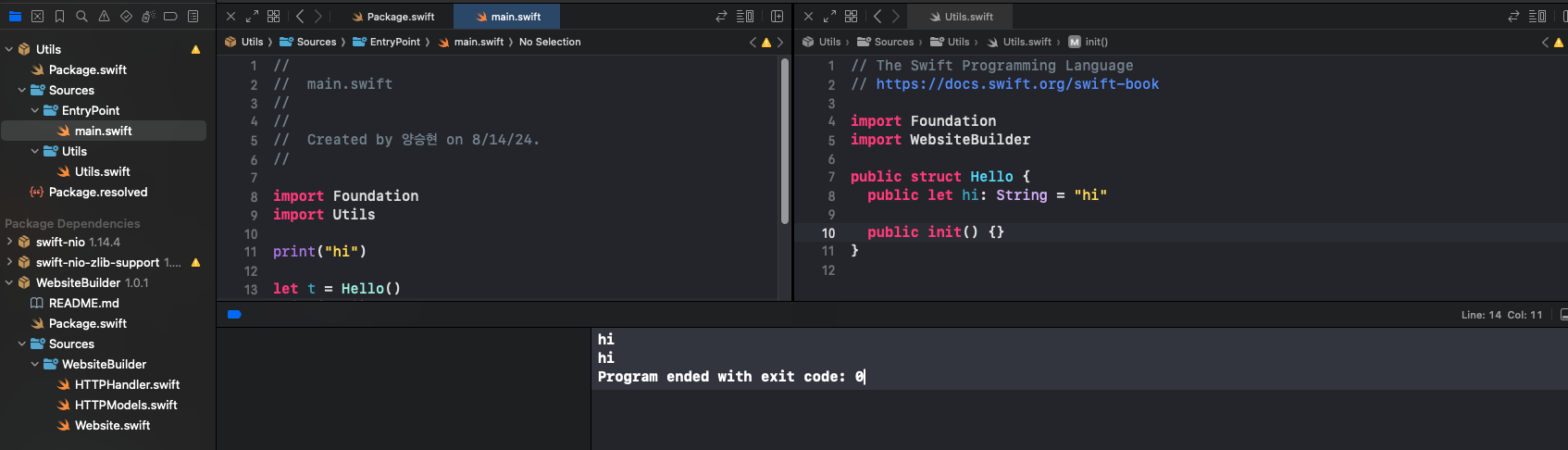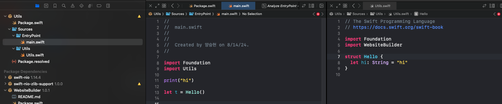 이제 프로젝트 네비게이터 탭에서 Utils 디렉터리 내부 Utils.swift에 오른쪽과 같이 Hello를 정의해주고.. Sources에 또 EntryPoint 디렉터리생성 및 내부에 main 파일 생성 및 위 사진과 같이 cmd+r로 실행 해보기실 바랍니다.