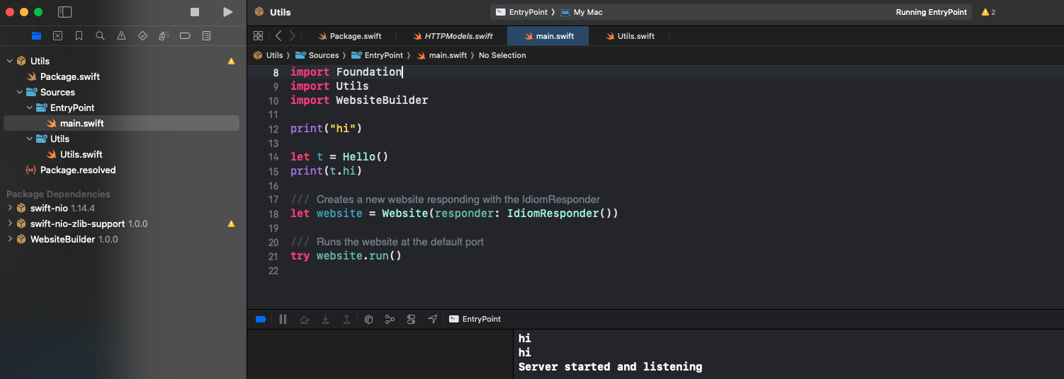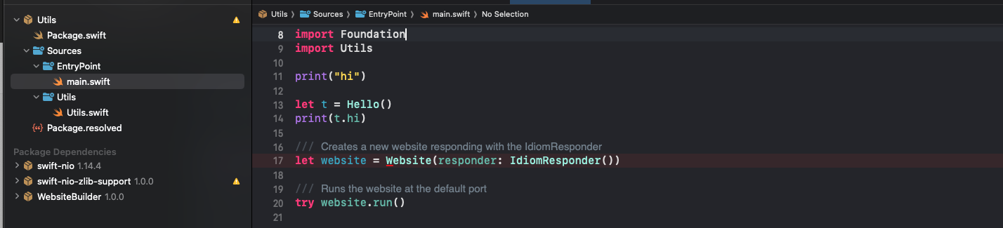 제가 시도하는 목적은 WebBuilder Package를 dependencies로 추가해서, Utils library에 Hello, IdiomResponder 구조체를 선언하고, EntryPoint executable에서 로컬 라이브러리 및 외부 라이브러리 의존성들을 추가해서 kodeco에서의 흐름과 유사하게 실행까지 해볼 것입니다.