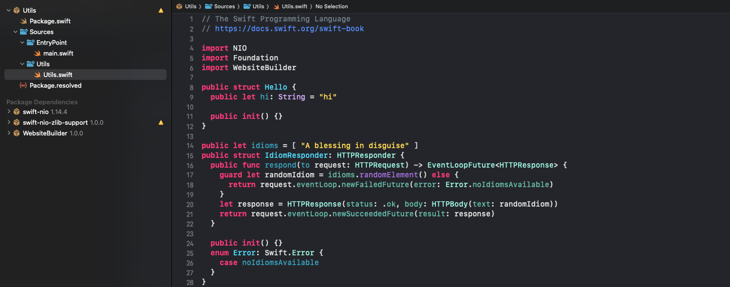 위에 언급한 kodeco 포스트에서 1 page IdiomResponder 구조체를 보면, 내부적으로 WebsiteBuilder library's HTTPModels에서 정의된 HTTPResponder를 사용합니다. 이 객체를 Utils의 Utils.swift파일에서 정의할 것입니다.
