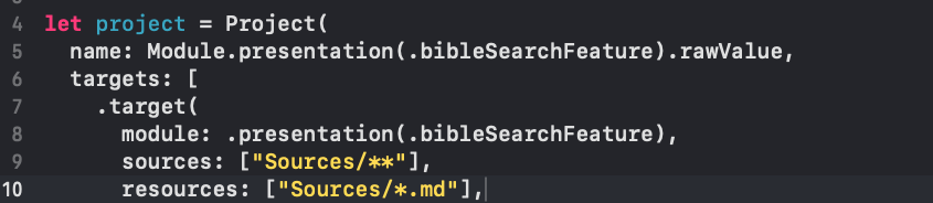 Tuist를 사용하며 Project를 생성하기 위한 Target을 정의할 때 Sources 매개변수의 값으로 ["Sources/**"] 이렇게 지정한다면 마크다운(md) 파일이 타겟에 인식이 되지 않을 수 있습니다. 기본적으로 소스 코드는(.swift, .m. ,h) 등만 인식이 되고 .md파일은 resources에서 인식한다고 합니다.