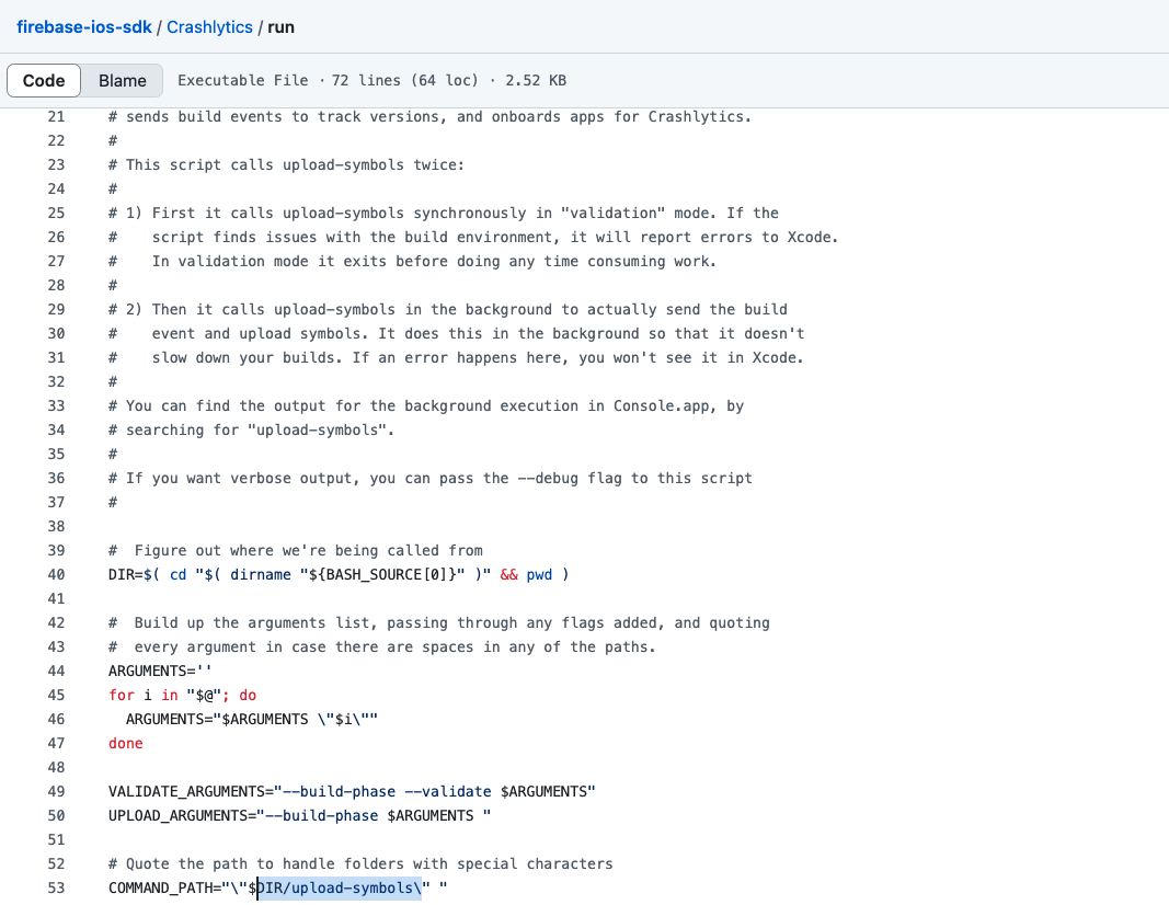Crashlytics/upload-symbols 바이너리를 호출해주는 것입니다. (내부적으로 dSYM파일을 Firebase Crashlytics 서버에 업로드 해서 크래시 리포트를 우리가 읽을 수 있는 형식으로 심볼화 해주는것 입니다 런타임 때 크래시가 날 때 어느 클래스의 어느 함수를 실행할 때 앱이 튕긴다거나를 알 수 있게 됩니다.)
