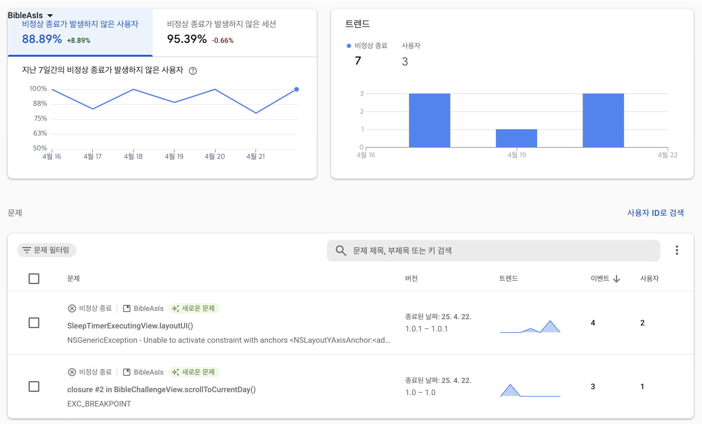 실제로 배포중인 앱이 비정상적인 종료를 발생했는데, 크래시 로그가 firebase crashlytics 로그에 나타나서 다행히 수정할 수 있게되었습니다.