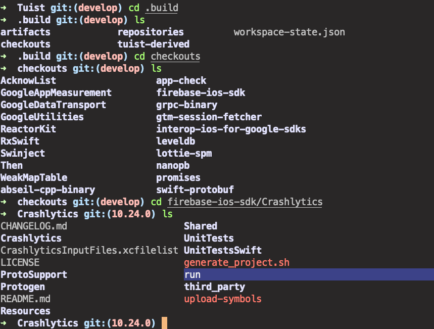 그래서 이렇게 checkouts에 보면 SPM으로 추가한 의존성들 그 의존성들이 내부적으로 의존하는 dependency가 클론됩니다. 그래서 firebase-ios-sdk/Crashlytics 디렉터리에서 run을 찾도록 script를 작성해주면 됩니다.