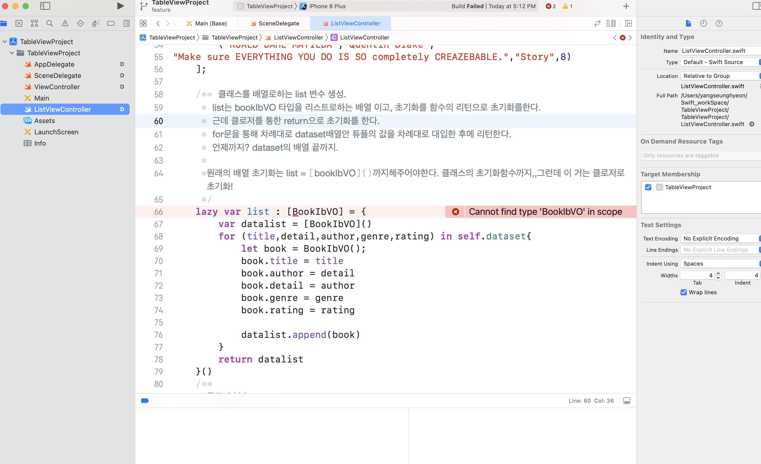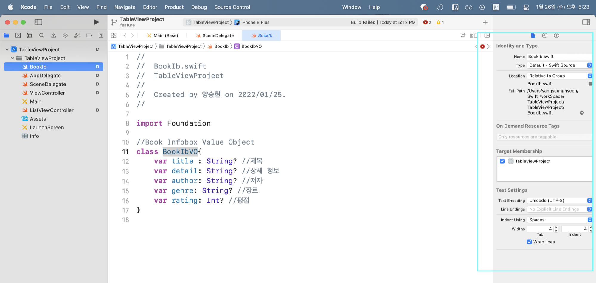 BookIb.swift 소스파일에서 인스펙터 옵션을 본 후에 target 설정을 하려했지만 아예 인스펙터 옵션이 뜨지 않았다.