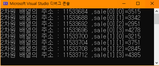 printf("2차원 배열의 주소 : %u ,sale[%d][%d]=%d\n", p, i / 4, i % 4,*p);