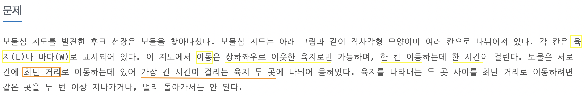 - 이때 한 칸 이동시에 1시간이 걸리는데, 가장 긴 시간이 걸리는 육지 두 곳에 보물이 묻혀있습니다.
