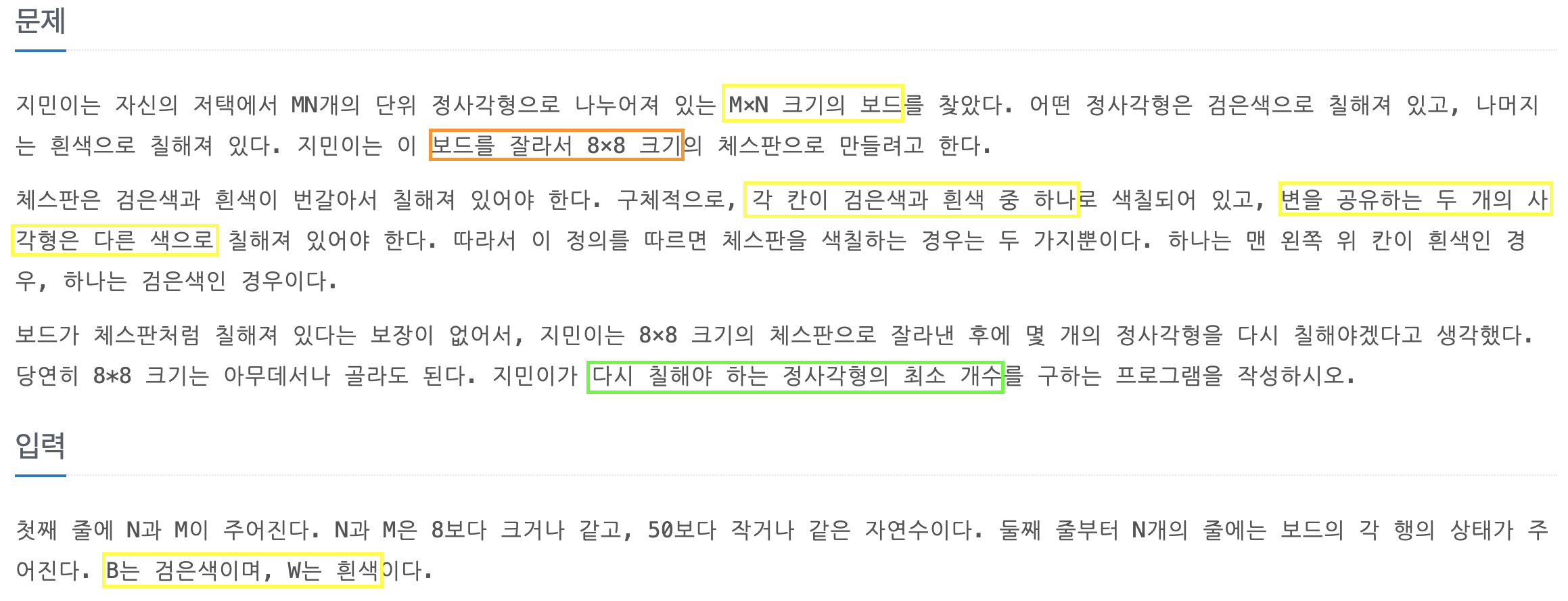 이때 체스판의 각 칸은 검(B) or 흰(W) 중 한개로 칠해져 있는데,