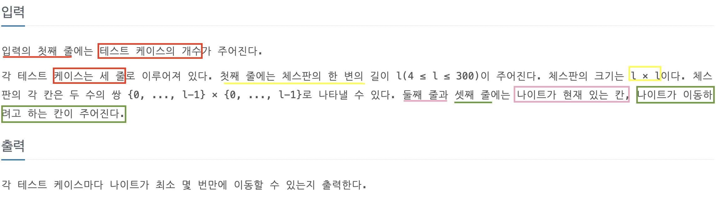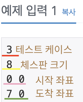테스트 케이스마다 체스판의 크기 , 시작좌표에서 나이트가 한 번에 이동할 수 있는 칸을 통해 '최소한'으로 도착좌표에 도달하는 것이 이 문제입니다.