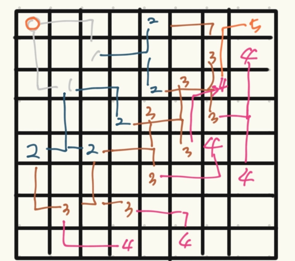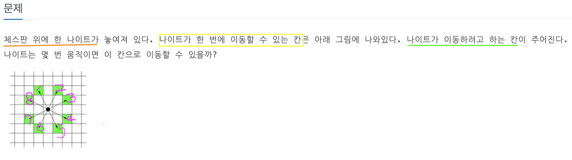 이번엔 분홍색으로 한칸, 녹색 경로로 두칸 이동, 황색경우로 2칸 이동을 해서 결국 '5번'이라는 나이트의 최소 이동으로 도착 지점을 찾았습니다.