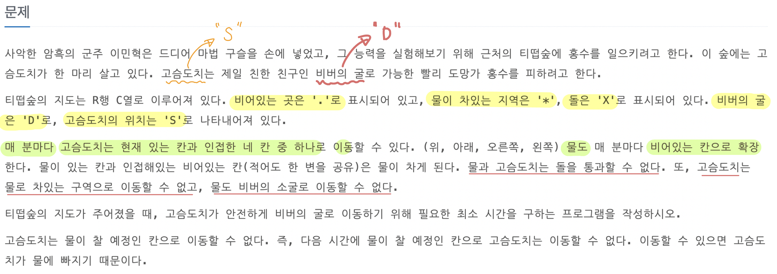매 분마다 물이 고인 곳에서 주변 으로 한칸씩 범람하는데, 고슴도치 또한 돌, 물이 없는 곳을 통해 한 칸 씩 이동할 수 있습니다.