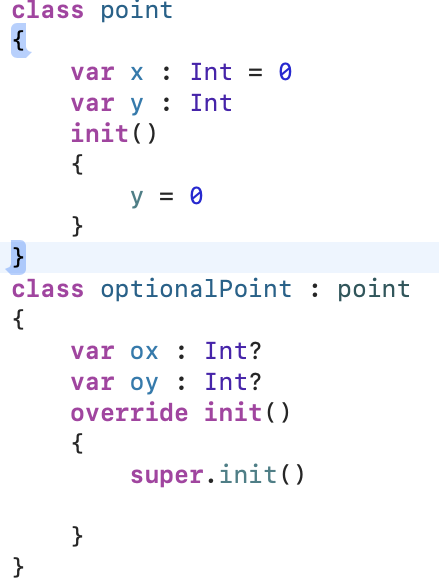 이때 C++과는 달리 자식클래스에서 init()을 구현할 경우 부모 클래스의 초기화 메서드를 호출하지 않는 한 부모 프로퍼티는 초기화 되지 않는다. 따라서 자식 클래스에서 부모 프로퍼티까지 전부 초기화를 해야한다.