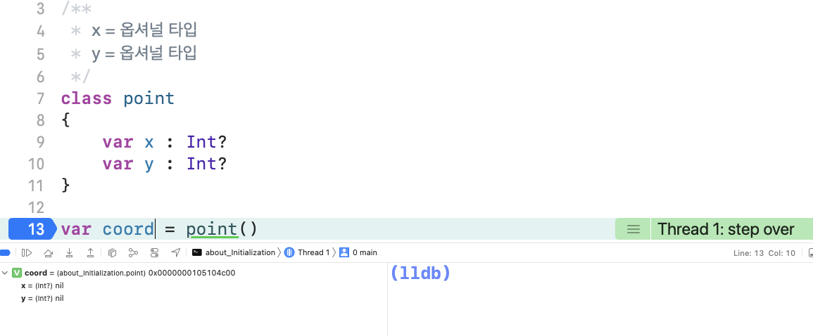 이 외에는 옵셔널 타입으로 만들면 초기화를 하지 않아도 자동으로 nil타입으로 초기화를 해준다.